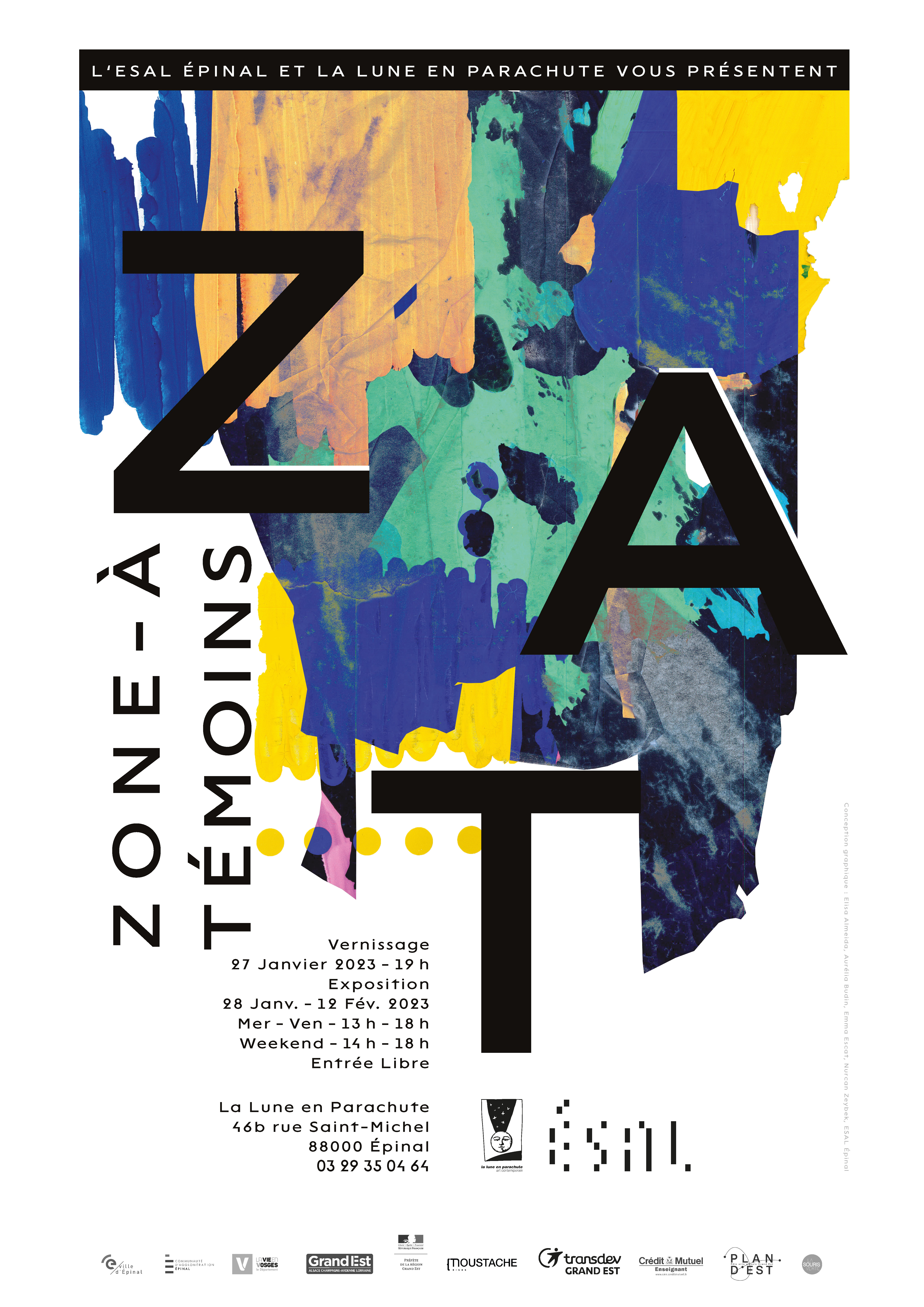 Z.A.T (Zone À Témoin) : Lieu d’exposition où se rencontrent diverses frontières. Une zone à traverser, traduire, trouver, troubler, typographier, tricher, tenter et tant d’autres.