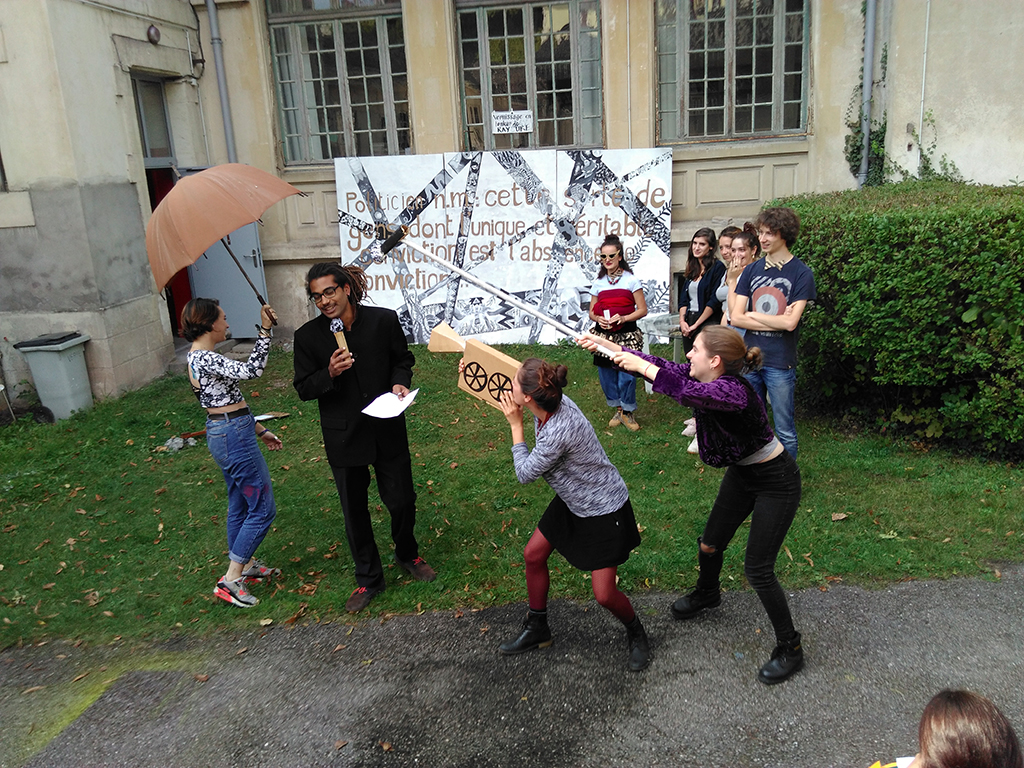 L’année commence en fanfare par le traditionnel « Grand bain » qui rassemble autour de projets communs les étudiants dans une joyeuse mixité. La thématique cette année était : rayures. Durant cette première semaine 9 groupes auront planché et réalisé des propositions plastiques et performatives. Celles-ci furent présentées dans l’après-midi du vendredi devant un public étudiant et enseignant ravi de se prêter au jeu.