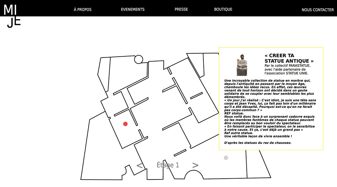 Le MIJE se revendique comme une œuvre complète et cohérente, nourrit uniquement par l’imagination de ces deux créateurs, Jimy et Ella. À l’instar du Magasin de Ben, le MIJE prend la forme d’un catalogue autonome, regroupant des envies communes : explorer divers médias, intervenir sur des œuvres existantes, manipuler les esthétiques, explorer divers modes narratifs et sonores… Bref rendre le musée plus vivant. |
